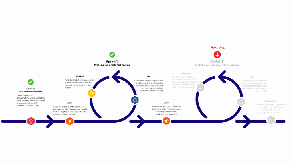 - Do (prototype development): We developed an initial version of the toolkit aligned with global practices and Indonesia’s Indeks Kualitas Kebijakan (IKK), emphasising flexible, modular supports suited to high-velocity policymaking contexts.