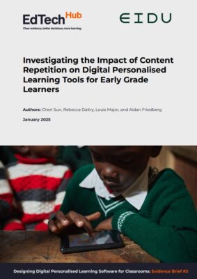 EdTech Hub has been co designing and testing software interventions to explore how digital personalised learning tools can better support early grade learning and teaching in Kenya. Read our four evidence briefs which share findings from four ABn software tests carried out with EIDU, a provider of digital personalised learning technology in Kenya.