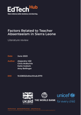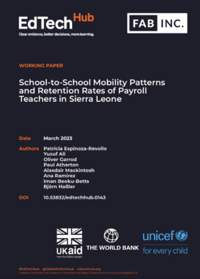 The outputs register lists all of the products produced as part of the EdTech Hub-commissioned research project on the impact of GIS-supported teacher allocation in Sierra Leone. This collaborative effort involved the contributions of EdTech Hub, Fab Inc, and the Education Workforce Initiative.