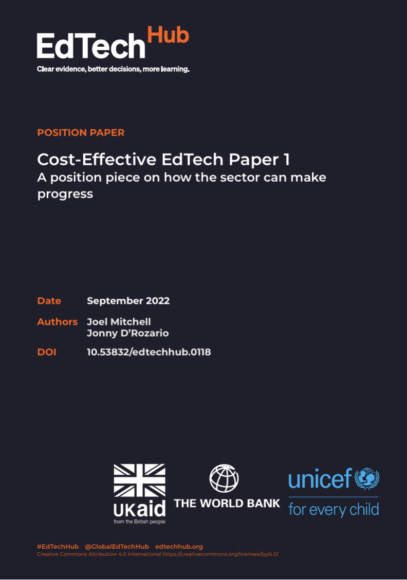 Mitchell, J., & D’Rozario, J. (2022). Cost-Effective EdTech Paper 1: A position piece on how the sector can make progress. EdTech Hub. https://doi.org/10.53832/edtechhub.0118