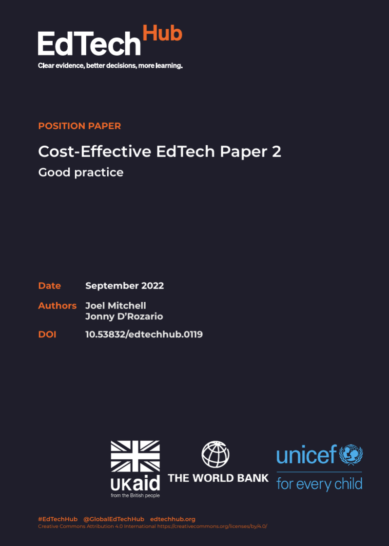 Mitchell, J., & D’Rozario, J. (2022). Cost-Effective EdTech Paper 2: Good practice. EdTech Hub. https://doi.org/10.53832/edtechhub.0119