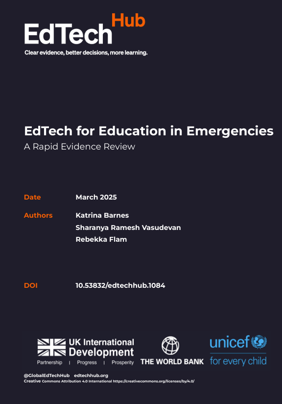 Barnes, K., Ramesh Vasudevan, S., & Flam, R. (2025). EdTech for Education in Emergencies: A Rapid Evidence Review. EdTech Hub. https://doi.org/10.53832/edtechhub.1084