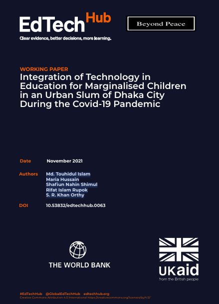 Islam, T., Hussain, M., Shimul, S. N., Rupok, R. I., & Orthy, S. R. K. (2021). Integration of Technology in Education for Marginalised Children in an Urban Slum of Dhaka City During the Covid-19 Pandemic. EdTech Hub. https://doi.org/10.53832/edtechhub.0063