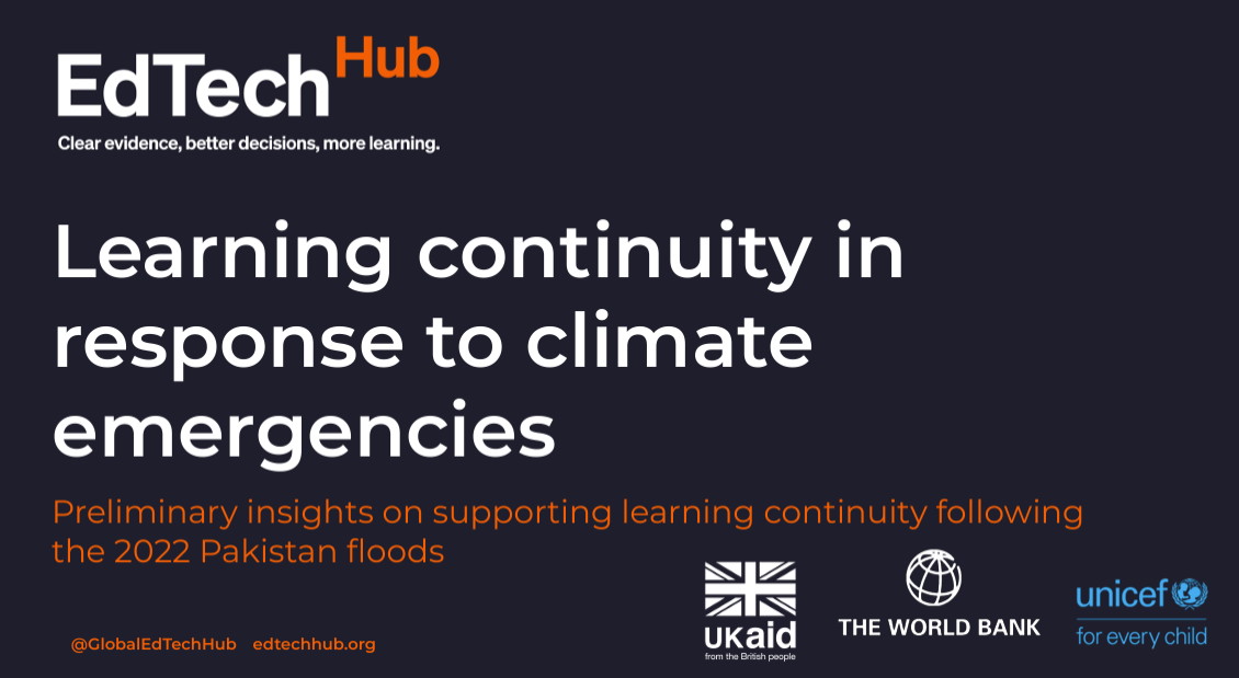 This resource is based on preliminary insights from EdTech Hub’s emerging study of Learning continuity in response to climate emergencies following the 2022 Pakistan floods. The intention is to support stakeholders to identify feasible ways of using EdTech in response to Pakistan’s 2022 floods. The design adopted for this resource balances generating primary insights from flood-affected parents and teachers quickly and complementing these with insights from the existing evidence base on education in emergencies globally and nationally.