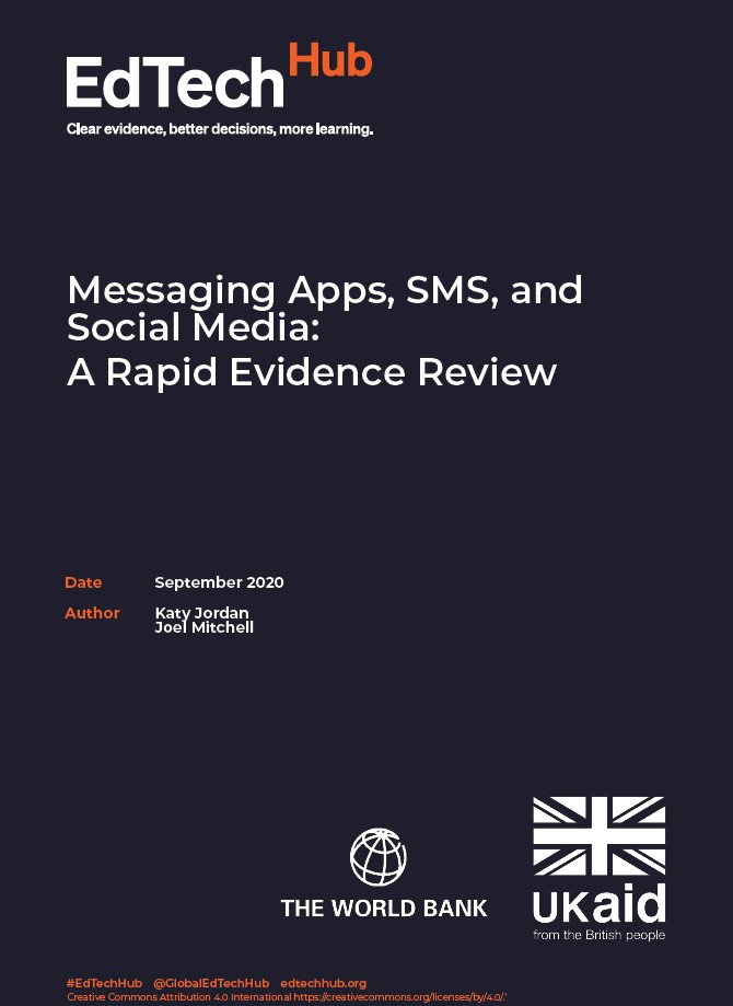 Jordan, K., & Mitchell, J. (2020). Messaging Apps, SMS, and Social Media: A Rapid Evidence Review (No. 8). EdTech Hub. https://doi.org/10.5281/zenodo.4556938. Available at https://docs.edtechhub.org/lib/XHBPFYVC.