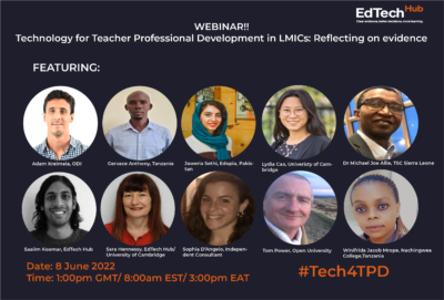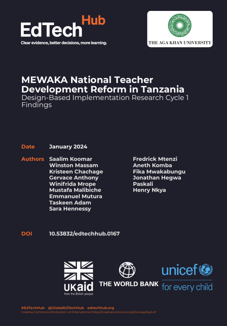 Koomar, S., Massam, W., Chachage, K., Anthony, G., Mrope, W. J., Malibiche, M., Mutura, E., Adam, T., Hennessy, S., Mtenzi, F., Komba, A., Mwakabungu, F., Paskali, J. H., & Nkya, H. (2024). MEWAKA National Teacher Development Reform in Tanzania: Design-Based Implementation Research: Cycle 1 Findings [Technical report]. EdTech Hub. https://doi.org/10.53832/edtechhub.0167