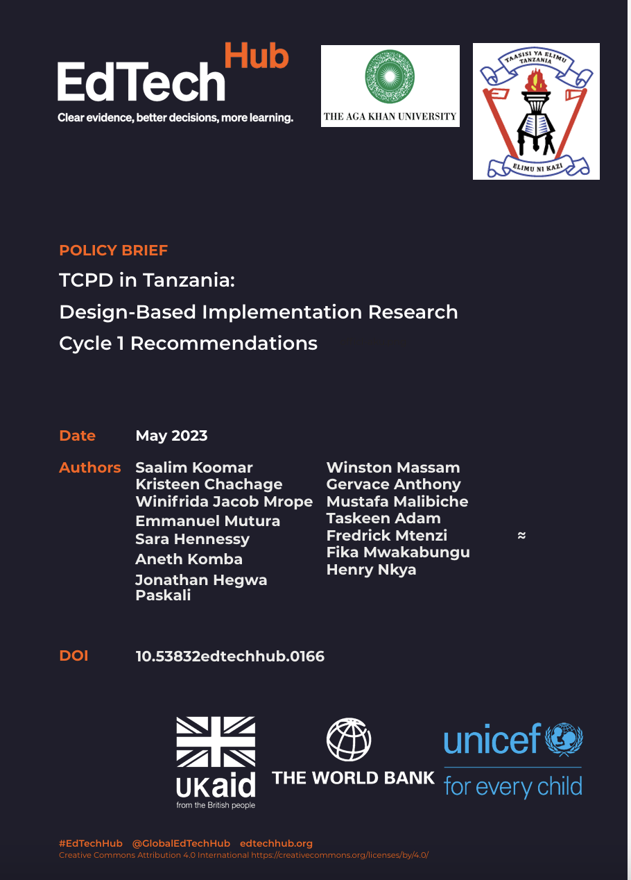 Koomar, S., Massam, W., Chachage, K., Anthony, G., Mrope, W. J., Malibiche, M., Mutura, E., Adam, T., Hennessy, S., Mtenzi, F., Komba, A., Mwakabungu, F., Paskali, J. H., & Nkya, H. (2023). TCPD in Tanzania: Design-Based Implementation Research Cycle 1 Recommendations Policy Brief. EdTech Hub. https://doi.org/10.53832/edtechhub.0166
