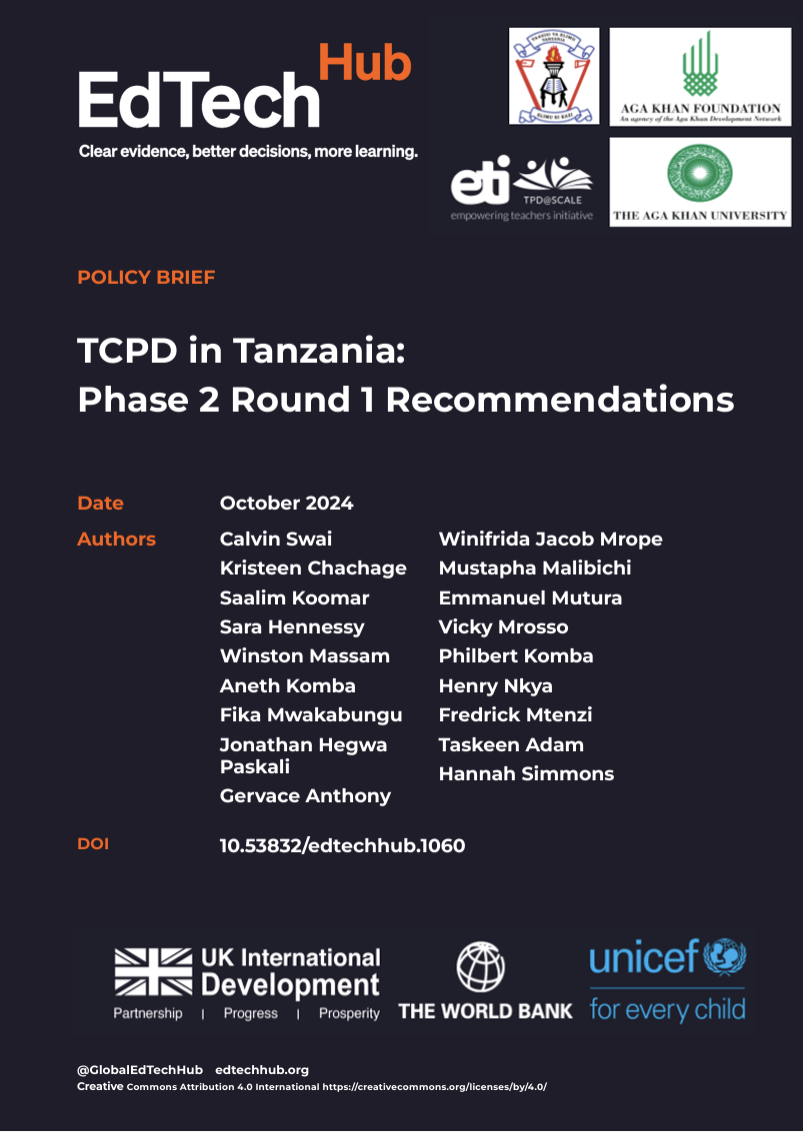 Swai, C., Chachage, K., Koomar, S., Hennessy, S., Massam, W., Komba, A., Mwakabungu, F., Paskali, J. H., Anthony, G., Mrope, W. J., Malibichi, M., Mutura, E., Mrosso, V., Komba, P., Nkya, H., Mtenzi, F., Adam, T., & Simmons, H. (2024). TCPD in Tanzania: Phase 2 Round 1 Recommendations. EdTech Hub. https://doi.org/10.53832/edtechhub.1060