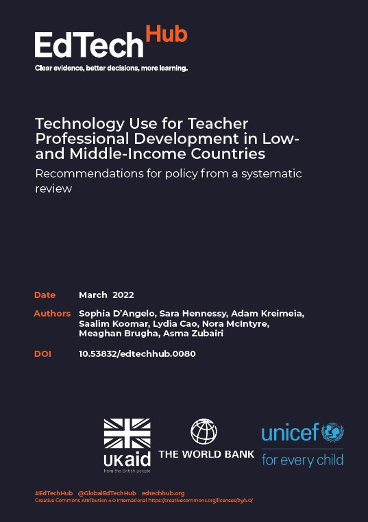 D’Angelo, S., Hennessy, S., Kreimeia, A., Koomar, S., Cao, L., McIntyre, N., Brugha, M., & Zubairi, A. (2022). Technology Use for Teacher Professional Development in Low- and Middle-Income Countries: Recommendations for policy from a systematic review. EdTech Hub. https://doi.org/10.53832/edtechhub.0080. Available at https://docs.edtechhub.org/lib/7S9CUP77