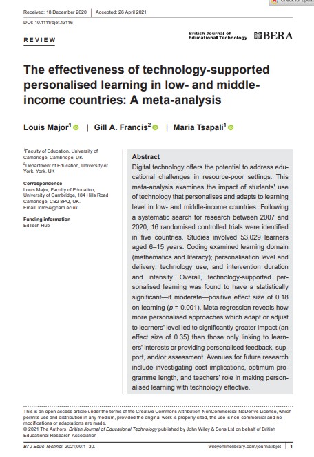 Major, L., Francis, G. A., & Tsapali, M. (2021). The effectiveness of technology-supported personalised learning in low- and middle-income countries: A meta-analysis. British Journal of Educational Technology, 52(5), 1935–1964. https://doi.org/10.1111/bjet.13116