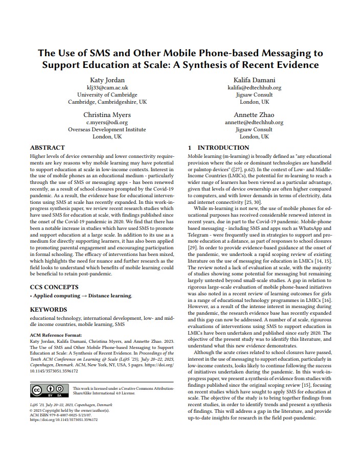Katy Jordan, Kalifa Damani, Christina Myers, and Annette Zhao. 2023. The Use of SMS and Other Mobile Phone-based Messaging to Support Education at Scale: A Synthesis of Recent Evidence. In Proceedings of the Tenth ACM Conference on Learning @ Scale (L@S ’23), July 20–22, 2023, Copenhagen, Denmark. ACM, New York, NY, USA, 5 pages. https://doi.org/10.1145/3573051.3596172