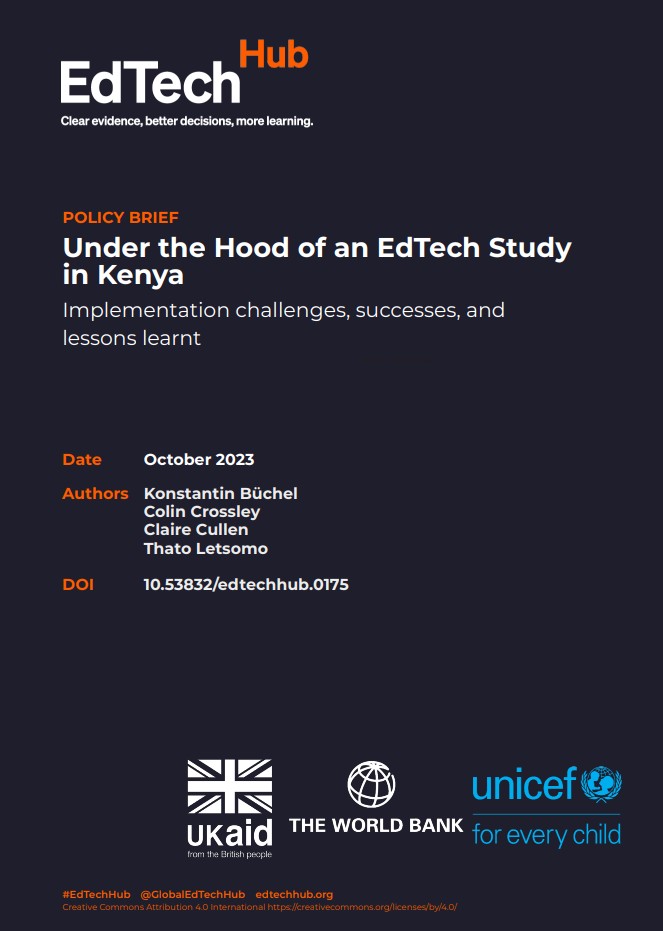 Büchel, K., Crossley, C., Cullen, C., & Letsomo, T. (2023). Under the Hood of an EdTech Study in Kenya: Implementation challenges, successes, and lessons learnt [Policy Brief]. EdTech Hub. https://doi.org/10.53832/edtechhub.0175