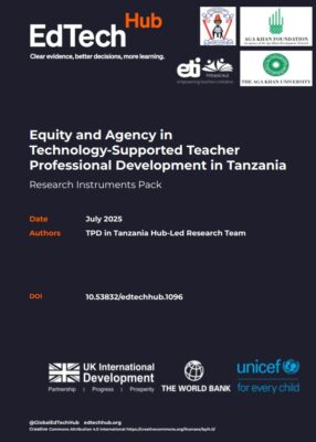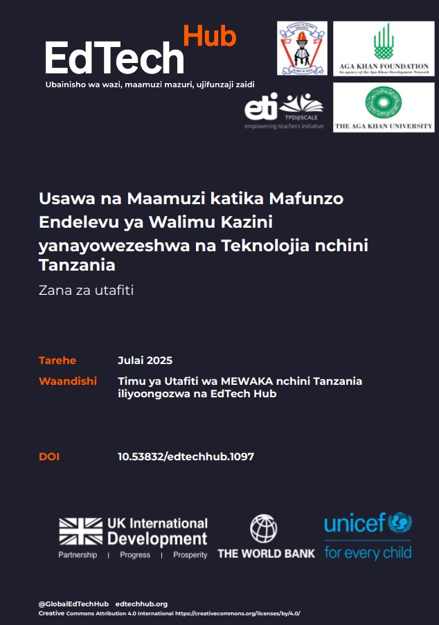 Chachage, K., Swai, C., Rwambali, I., Hennessy, S., Koomar, S., Massam, W., Jacob, W., Anthony, G., Malibiche, M., Mutura, E., Adam, T., Mwakabungu, F., Mrosso, V., Komba, P., & Mtenzi, F. (2025). Usawa na maamuzi katika Mafunzo Endelevu ya Walimu Kazini yanayowezeshwa na Teknolojia nchini Tanzania: Zana za utafiti. EdTech Hub. https://doi.org/10.53832/edtechhub.1097. Available at https://docs.edtechhub.org/lib/IQXW2UG5.