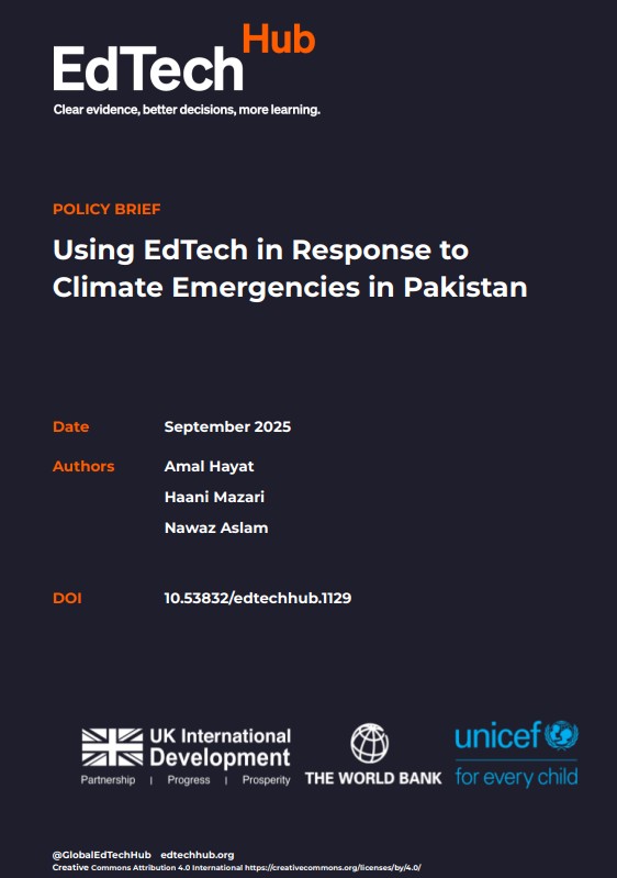 Hayat, A., Mazari, H., & Aslam, N. (2025). Using EdTech in Response to Climate Emergencies in Pakistan. EdTech Hub. https://doi.org/10.53832/edtechhub.1129. Available at https://docs.edtechhub.org/lib/8GVHGX36