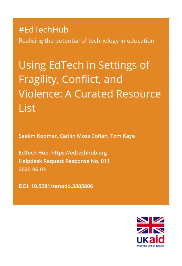 Koomar, S., Moss Coflan, C., & Kaye, T. (2020). Using EdTech in Settings of Fragility, Conflict and Violence: A Curated Resource List (No. 11). EdTech Hub. https://doi.org/10.53832/edtechhub.0042