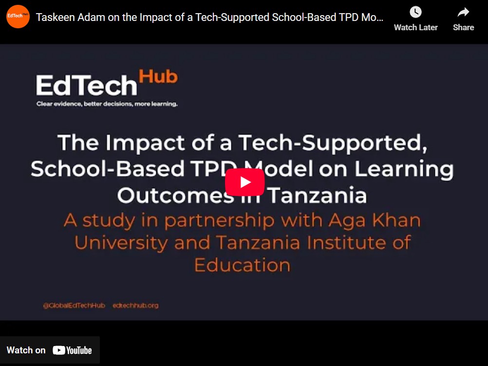 The study examines effective and cost-effective, sustainable, technology-supported, decentralised, school-based Teacher Continuous Professional Development (TCPD) models aimed at improving learning outcomes in rural primary schools in Tanzania. It uses a design-based implementation research (DBIR) approach in the first phase, followed by a cluster randomised control trial (RCT) in the second. The RCT will compare three groups to assess the added value of technology by testing the same school-based TCPD model with and without school-level tech mediation, and against business-as-usual, while also measuring cost-effectiveness. In this video, Dr. Taskeen Adam, one of the study’s lead researchers, discusses why this work is so important.