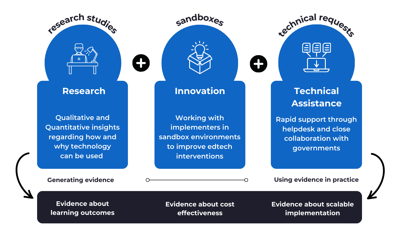 In order to tackle evidence gaps in a meaningful and measurable way, EdTech Hub aligns its work around big challenges using three methodological approaches — Research, Innovation, and Technical Assistance, which act as the common threads that link our programmes across education sectors globally.